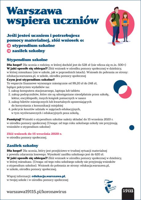 Dla kogo? Dla ucznia z rodziny, w której dochód jest do 528 zł (nie wlicza się m.in. 500+) W jaki sposób się ubiegać? Złóż wniosek w ośrodku pomocy społecznej w dzielnicy, w której mieszkasz (nie w szkole, jak w poprzednich latach). Wniosek do pobrania ze strony: edukacja.warszawa.pl, w szkole, ośrodku pomocy społecznej Czym jest stypendium szkolne?